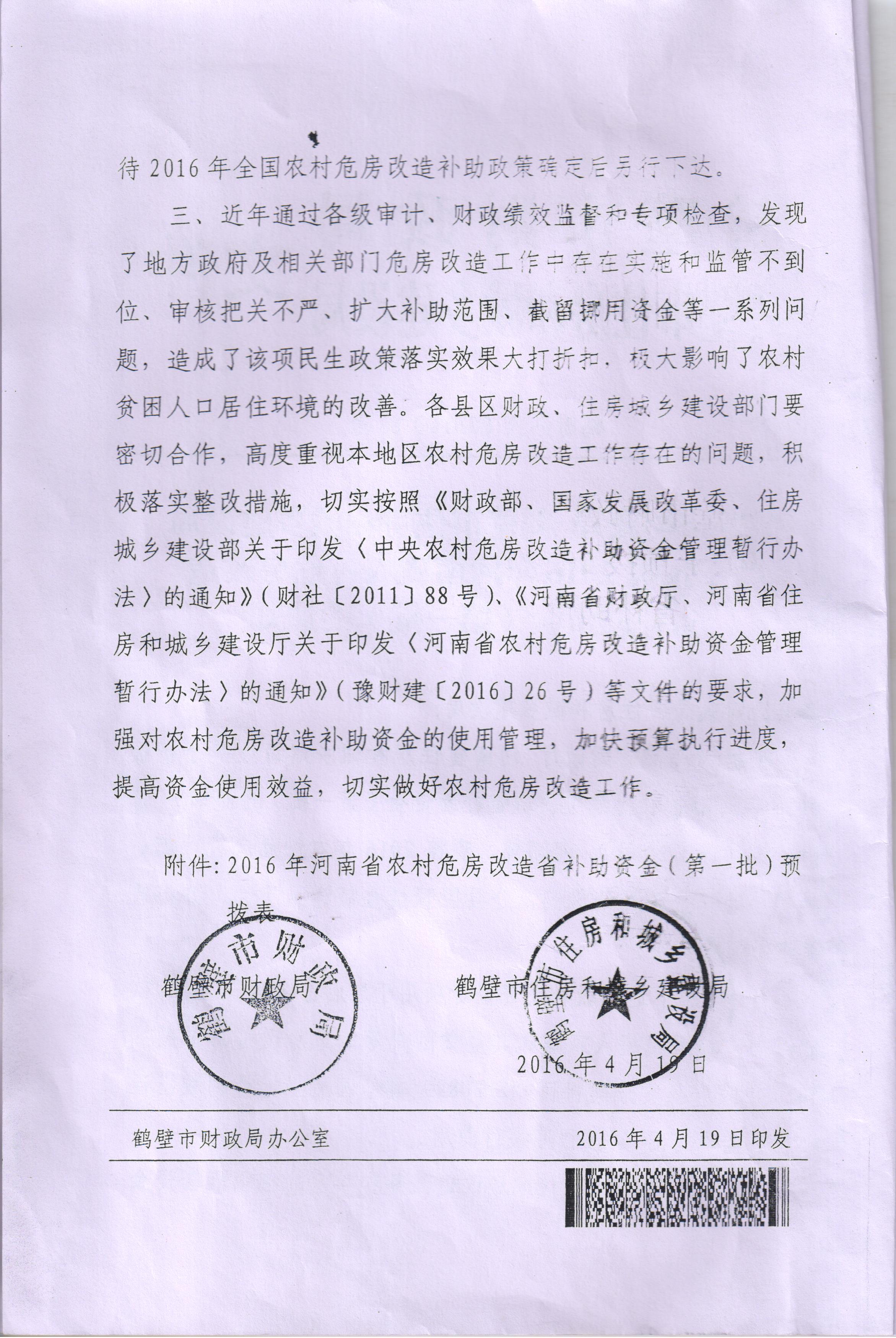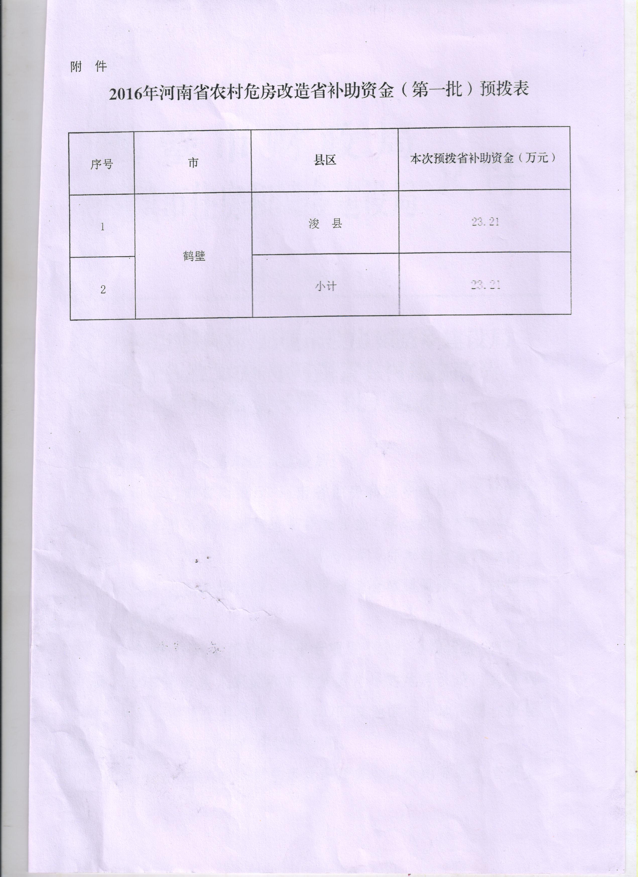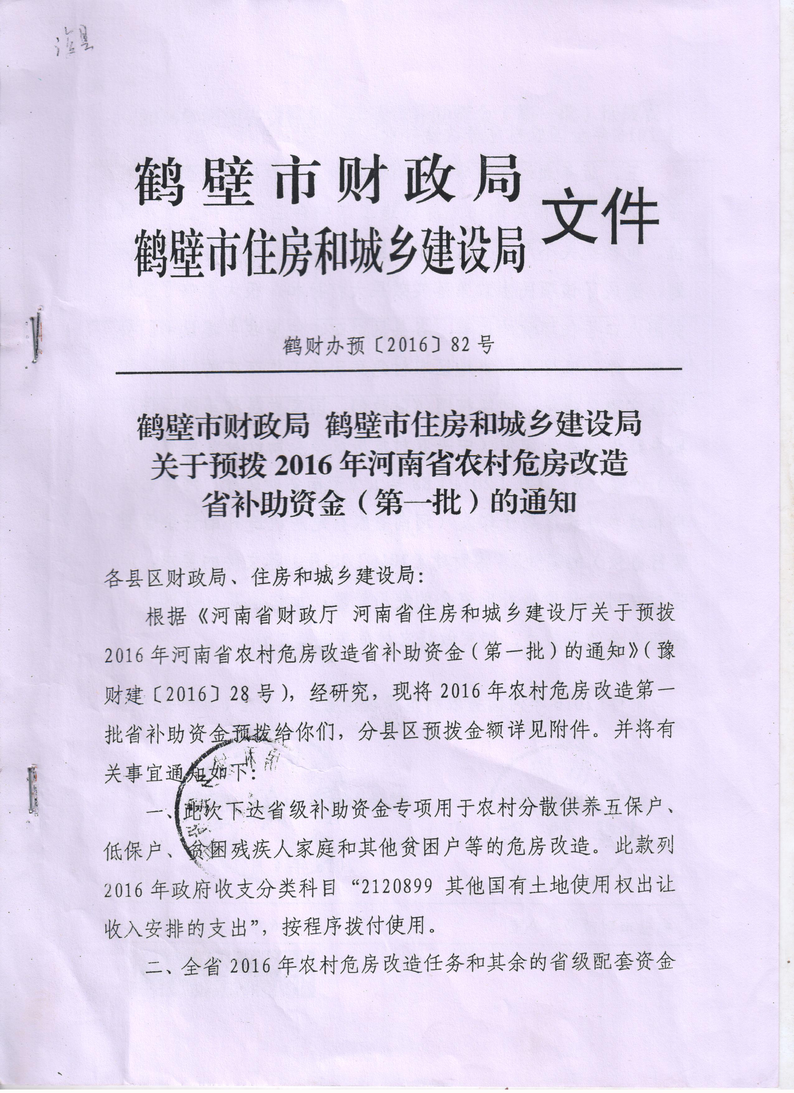关于预拨2016河南省农村危房改造省补助资金(第一批)的通知